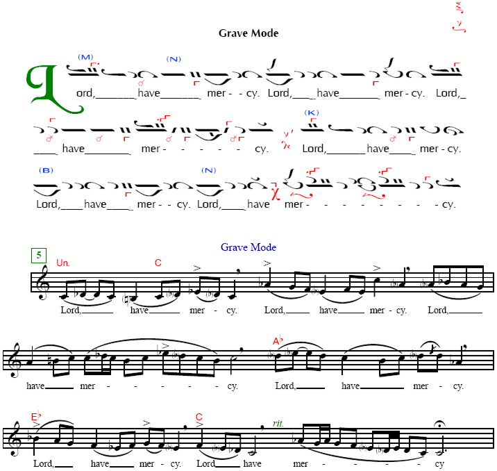 Le travail d’adaptation du chant byzantin se développe en d’autres langues partout dans le monde, suivant l’implantation grandissante de l’Orthodoxie. En dehors de l’anglais, c’est l’allemand, le néerlandais,le hongrois, l’ukrainien, le finlandais, l’albanais, le coréen, les dialectes de l’Indonésie, etc ; on retrouve partout la même préoccupation de créer tout un répertoire de chant liturgique de type byzantin en langue autochtone. C’est surtout en Angleterre et en Amérique que beaucoup de partitions sont déjà réalisées, en double notation. L’avantage de l’anglais est bien sûr son usage universel à notre époque. Mais les différents dialectes des minorités comme le créole en Martinique ou les dialectes malgaches de Madagascar ainsi que le provençal ou le breton en France sollicitent aussi la création de nouvelles adaptations de chant byzantin. Chanter des hymnes divines dans sa propre langue est un désir pour tous les chrétiens, pour que la Parole soit « tout près de vous ». L’adaptation du chant byzantin dans toutes ces nouvelles langues est toujours une création. Pour remplir pleinement son rôle, elle doit tenir compte : et de la pratique traditionnelle des grecs, pour bénéficier de la force vivifiante des racines des origines,et de l’expérience des pays de tradition orthodoxe qui ont déjà réussi cette transplantation,et du caractère propre de la langue d’adaptation. C’est à ce prix que le texte sacré gardera sa primauté, car « la musique doit rester serviteur fidèle de la Parole ».